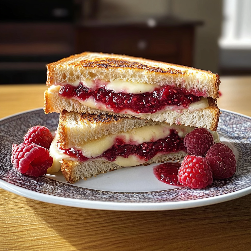 This sandwich combines sweet and tart raspberry jam with creamy Brie cheese, creating a delightful contrast of flavors.
