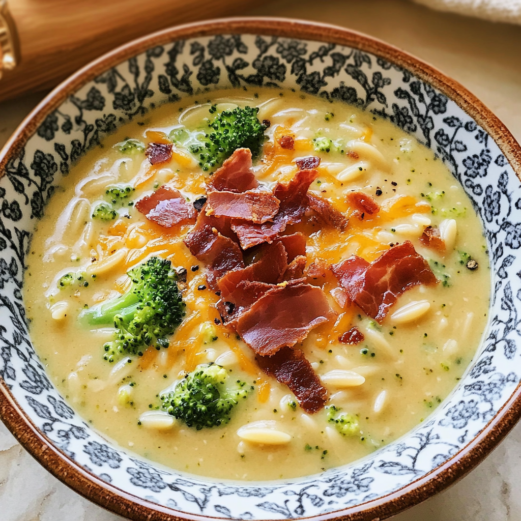 Broccoli Cheddar Orzo Soup with Crispy turkey slices is a delightful twist on a classic favorite. This creamy and comforting soup combines tender orzo pasta with the rich flavors of broccoli and cheddar, topped off with crispy turkey slices for an added crunch. Perfect for cozy dinners or gatherings, this dish is sure to impress your family and friends while being easy to prepare.