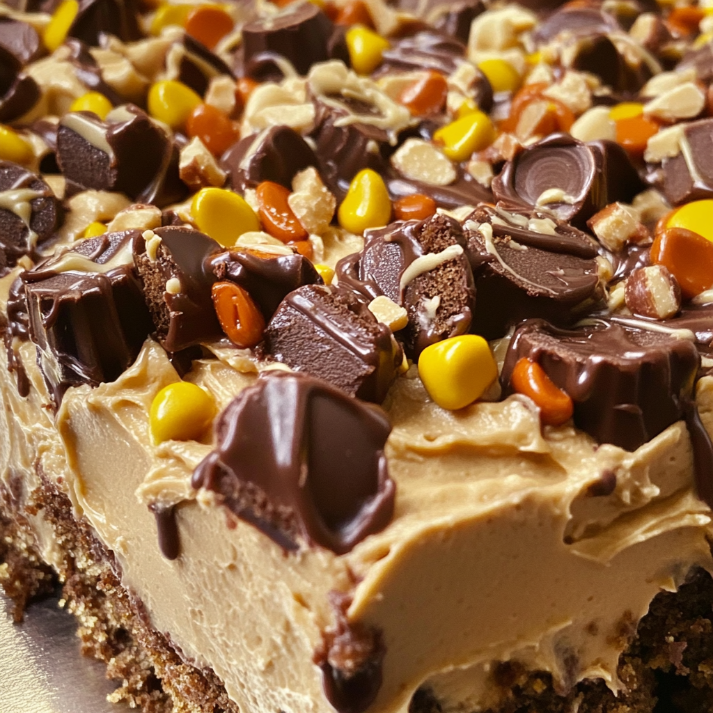 2. Top with chopped Reese’s Peanut Butter Cups and Reese’s Pieces.