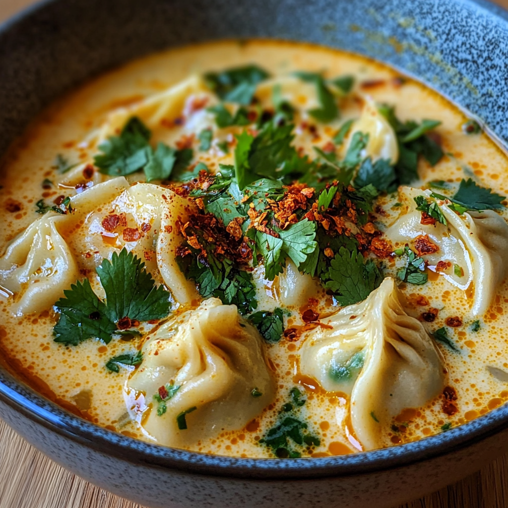 Savor the warmth of Coconut Curry Soup with Dumplings, a delightful blend of rich coconut milk and aromatic spices. This easy-to-make dish comes together in just 20 minutes, making it perfect for busy weeknights or cozy weekends. The addition of frozen dumplings adds both ease and heartiness to this comforting meal. With its flavorful profile and versatility, you can enjoy it as a main course or appetizer. Garnished with fresh herbs and chili oil, this soup is sure to become a favorite in your kitchen.