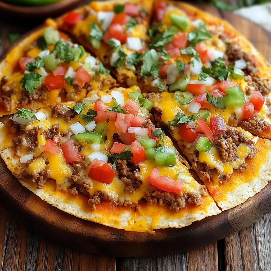 - Assemble pizzas by layering fried tortillas with enchilada sauce, refried beans, seasoned beef, more enchilada sauce, and cheddar cheese.