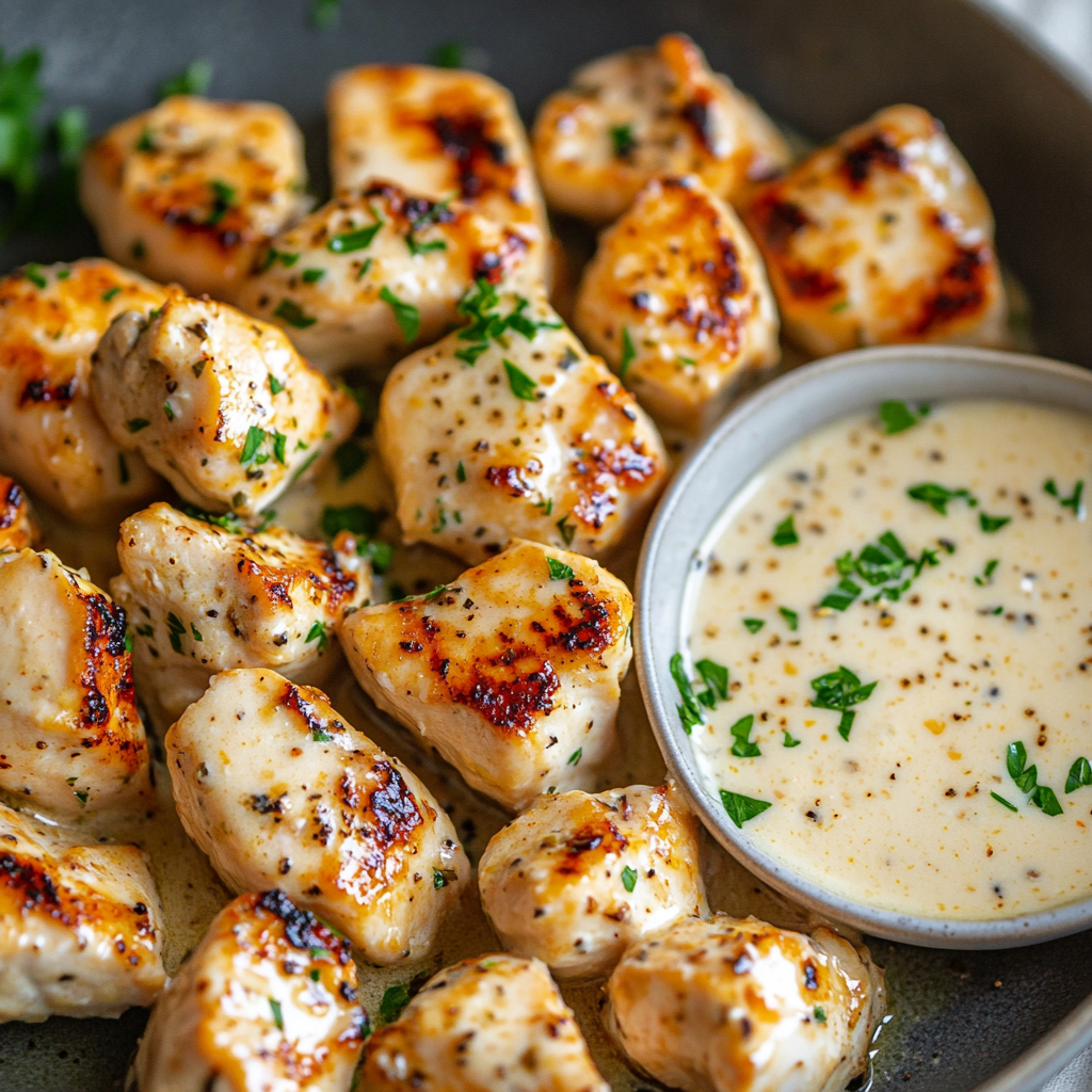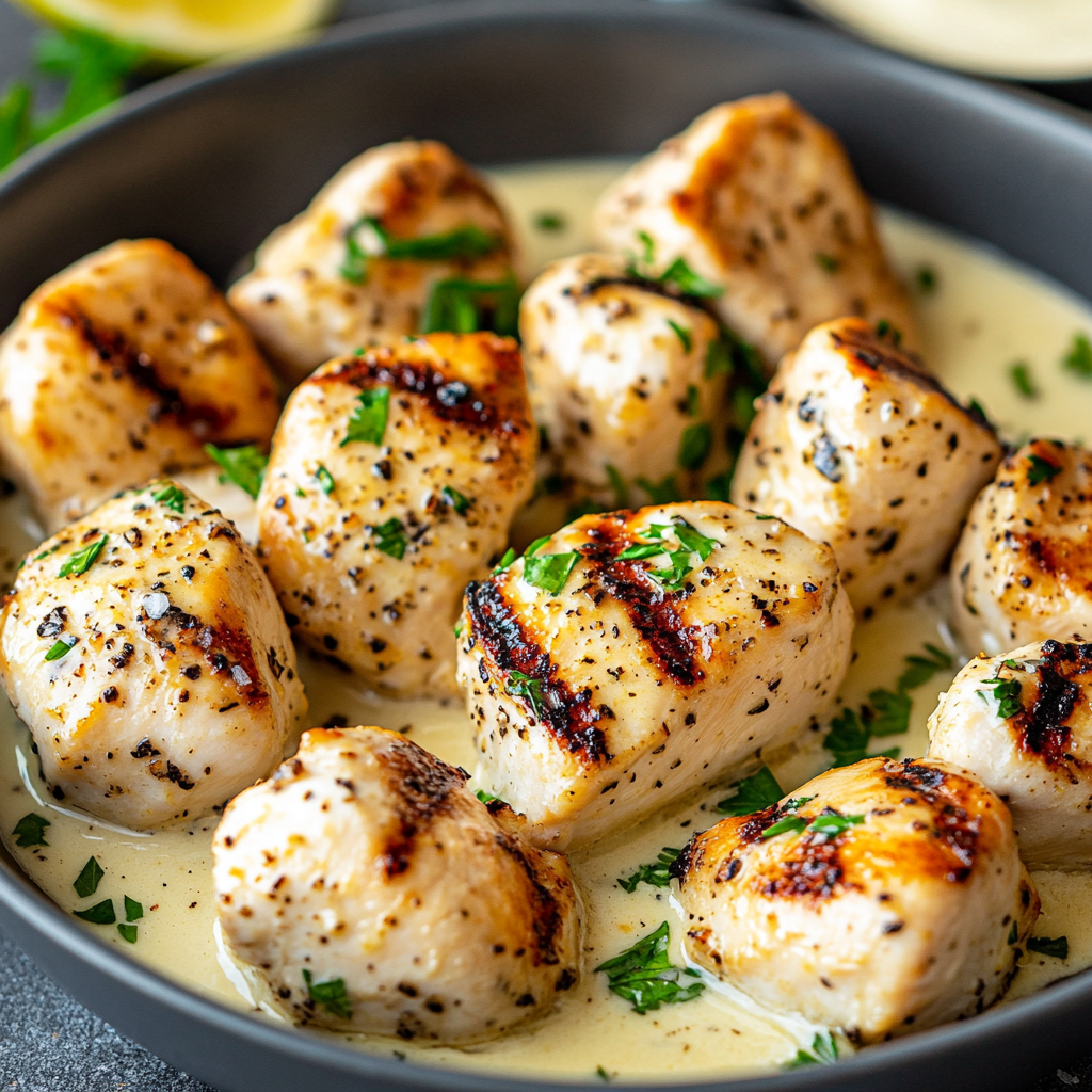 Get ready to elevate your culinary skills with this irresistible recipe for creamy garlic sauce paired with juicy grilled chicken bites. This dish is not only quick to prepare—taking about 30 minutes—but it also delivers a rich, savory flavor that will please everyone at the table. The tender chicken bites coated in a luscious, creamy garlic sauce create a comforting meal perfect for dinner, gatherings, or meal prep. Plus, it’s easily customizable, allowing you to incorporate your favorite vegetables and adjust seasonings to suit your taste. Whether served as an appetizer or main dish, this recipe promises to impress.