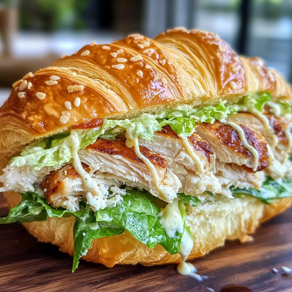 A buttery croissant filled with tender chicken, crisp romaine lettuce, and creamy Caesar dressing for a gourmet yet easy-to-make sandwich.