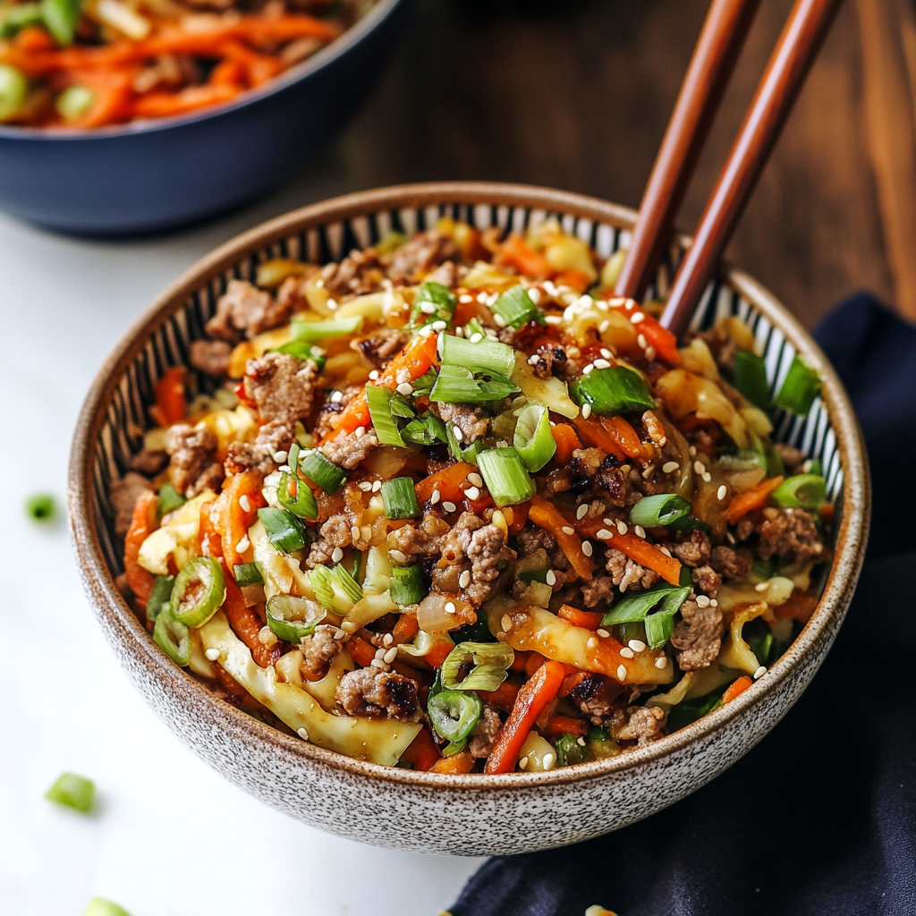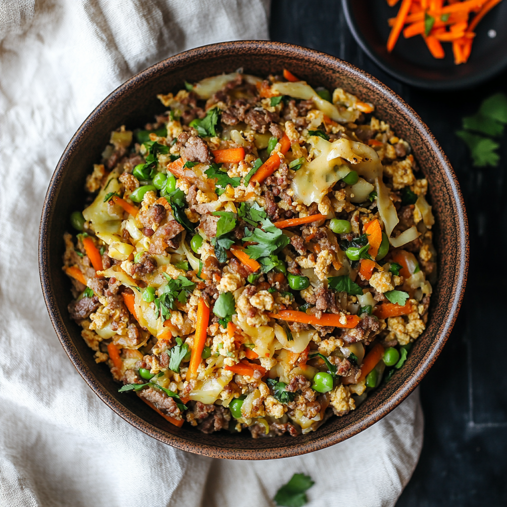 Paleo Egg Roll in a Bowl is a nutritious, low-carb twist on traditional egg rolls. It combines ground meat and vegetables stir-fried together with savory seasonings.