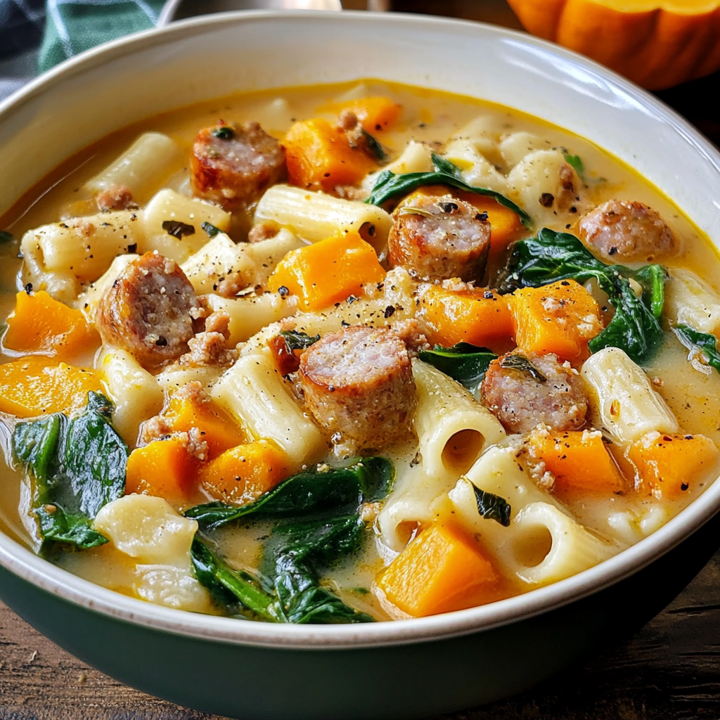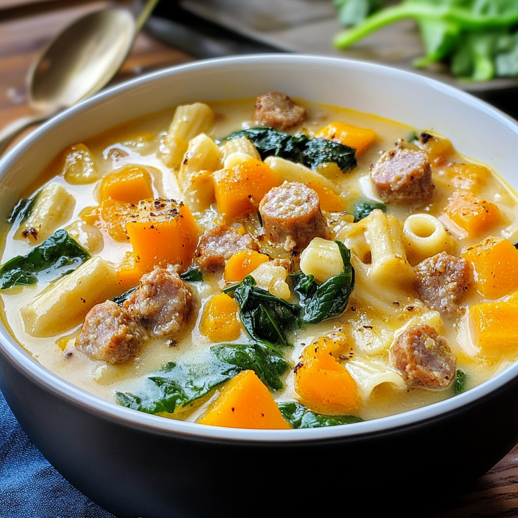Roasted Butternut and Beef Sausage Soup is a comforting dish made with roasted butternut squash, savory Beef sausage, fresh vegetables, pasta, and creamy broth.