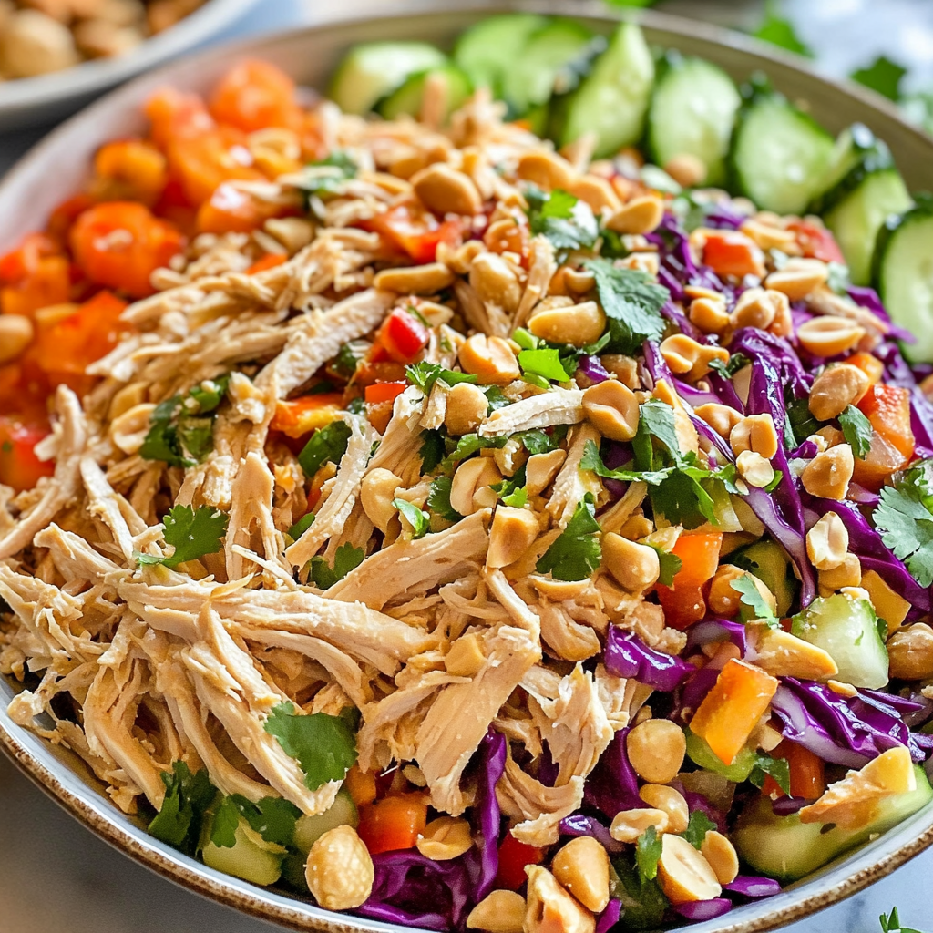 Thai Chicken Salad is a refreshing dish made with shredded chicken, crunchy vegetables, and a flavorful peanut dressing that combines sweet, savory, and spicy elements.