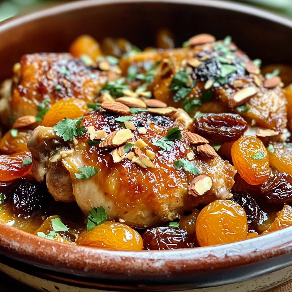 A fragrant and slow-cooked Moroccan dish with tender chicken, warm spices, dried fruits, and almonds, perfect for serving with couscous or bread.